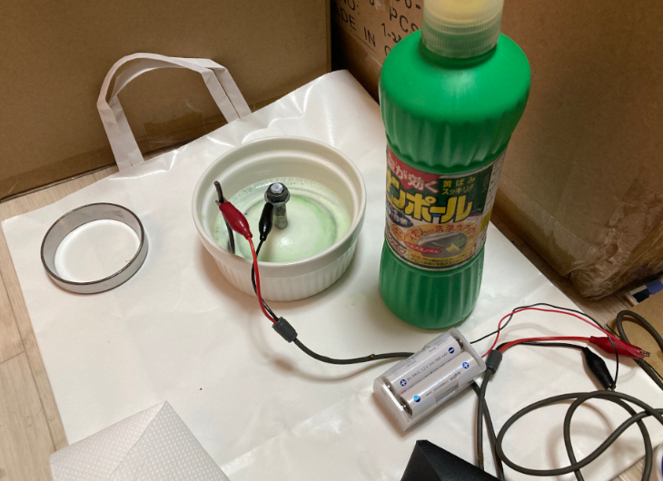 ポンプブラケットに錆止めの亜鉛メッキをつける。写真は電解メッキ練習中。