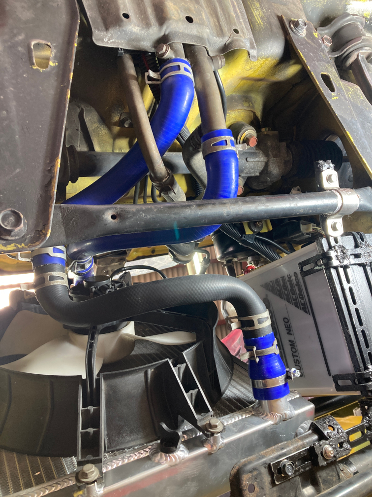 ホース取り回しはかなーり悩んだけど、御覧の通りビート純正のラジエターロアホース2本でつながった。