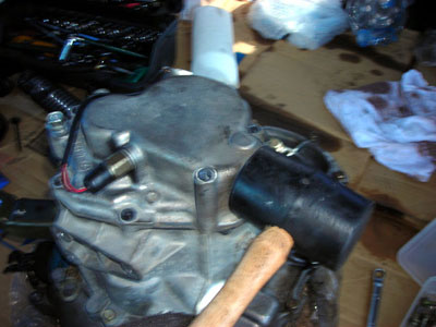 サイドカバーをゴムハンマーで叩いて外す。