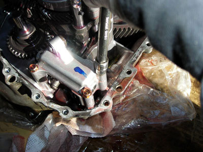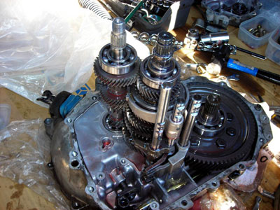 メインシャフトとドライブピニオンとシフタロッド×3を一緒に抜く。