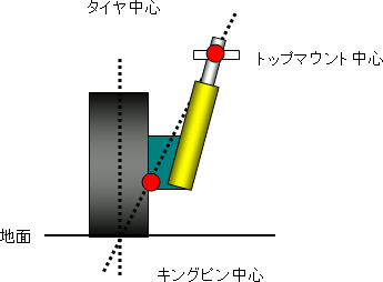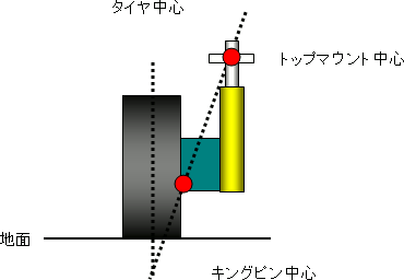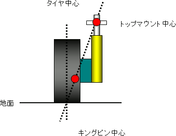 キングピン中心からトップマウント中心の延長線がタイヤ中心と設置面で交わる。